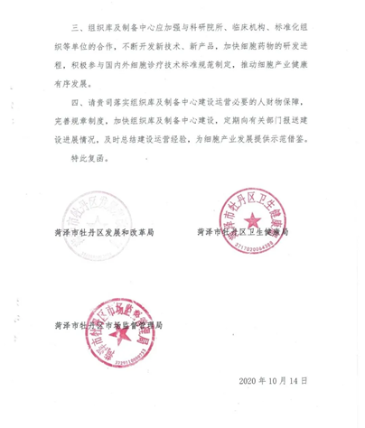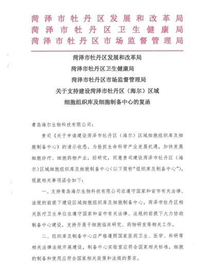 10月14日,菏泽市牡丹区发展和改革局、卫生健康局、市场监督管理局联合下发《关于支持筹建菏泽市牡丹区(海尔)区域细胞组织库及细胞制备中心的复函》,正式批复同意青岛海尔生物科技有限公司开展菏泽市牡丹区区域细胞制备中心的建设工作。