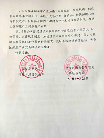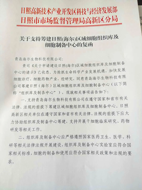 9月29日,日照高新技术产业开发区科技与经济发展部、日照市市场监督管理局高新区分局联合下发《关于支持筹建日照(海尔)区域细胞组织库及细胞制备中心的复函》,正式批复同意青岛海尔生物科技有限公司开展日照市区域细胞制备中心的建设工作。
