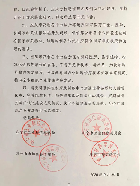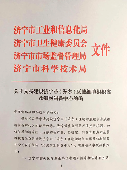 9月30日,济宁市工业和信息化局、济宁市卫生健康委员会、济宁市市场监督管理局和济宁市科学技术局联合下发《关于支持建设济宁市(海尔)区域细胞组织库及细胞制备中心的函》,正式批复同意青岛海尔生物科技有限公司开展济宁市区域细胞制备中心的建设工作。