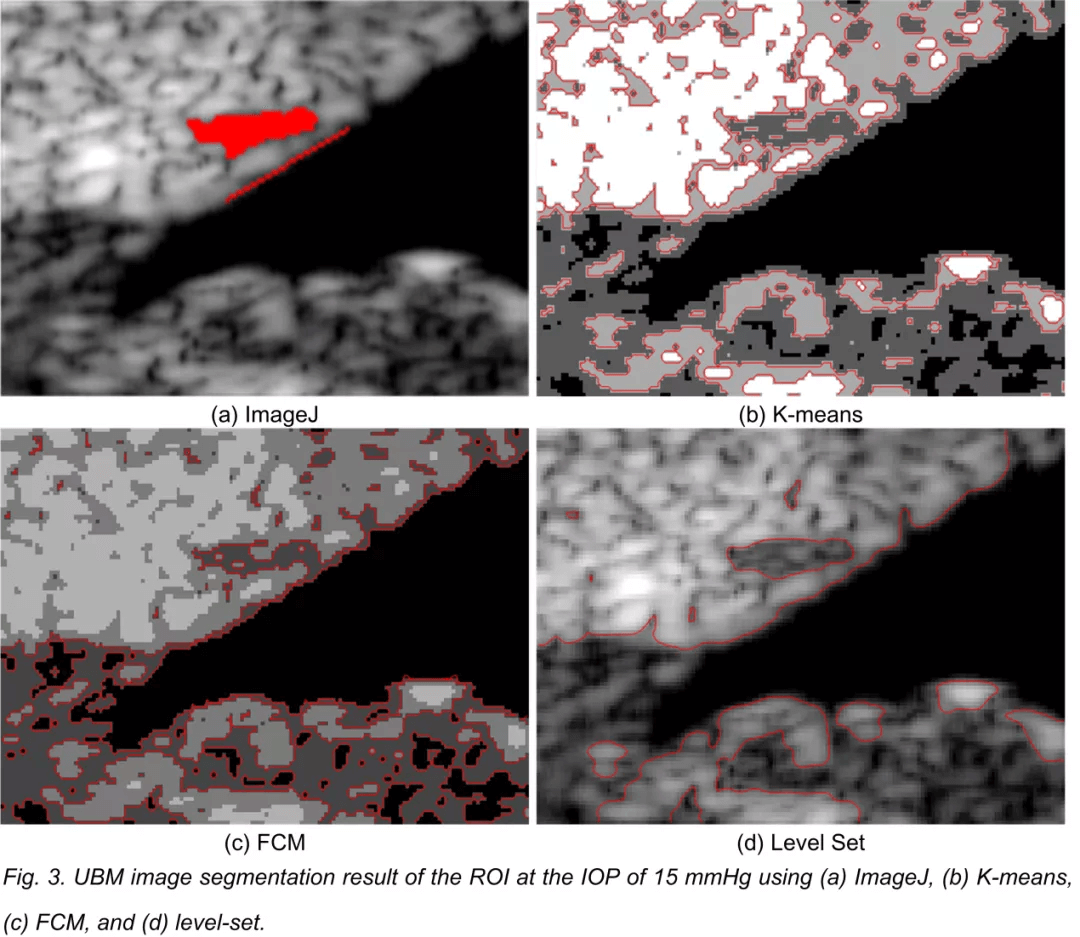 此研究中,团队共招募了26名健康志愿者,让这些研究对象吹喇叭,同时测量他们的眼压(IOP),利用50MHz的超声生物显微镜(UBM)在不同IOPs下获取图像。再通过ImageJ软件,分别使用k-means、模糊c-means (FCM)、level set三种分割方法对UBM图像进行分割。最后基于分割结果对TM-SC区域(小梁网Schlemm管区域)进行定量分析。用相对误差和组间相关系数(ICC)来量化测量的准确性和重复性。Pearson相关分析评估IOP与TM和SC几何测量值之间的关系。