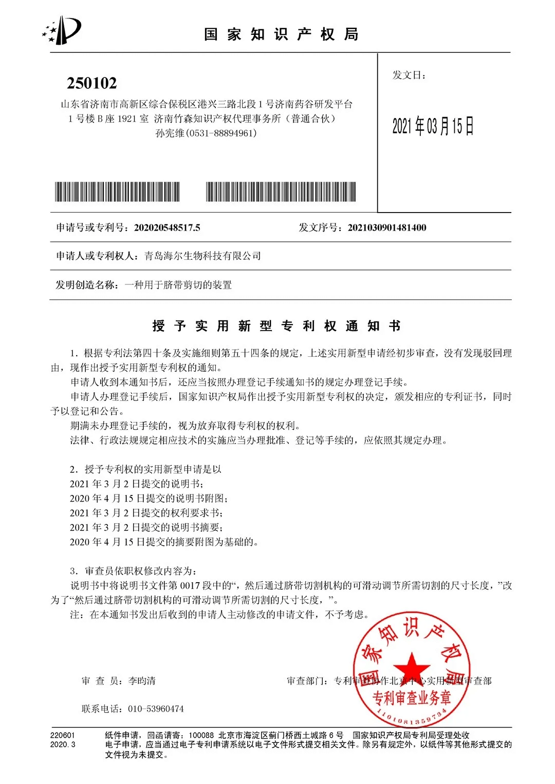 此次获得授权的两项专利技术,只是海尔生物科技提报的众多发明专利中的一部分。据企业研发副总裁曹启龙博士介绍,近期公司已提报十余项专利,目前正在审批过程中,未来将有更多专利成果获得正式授权。