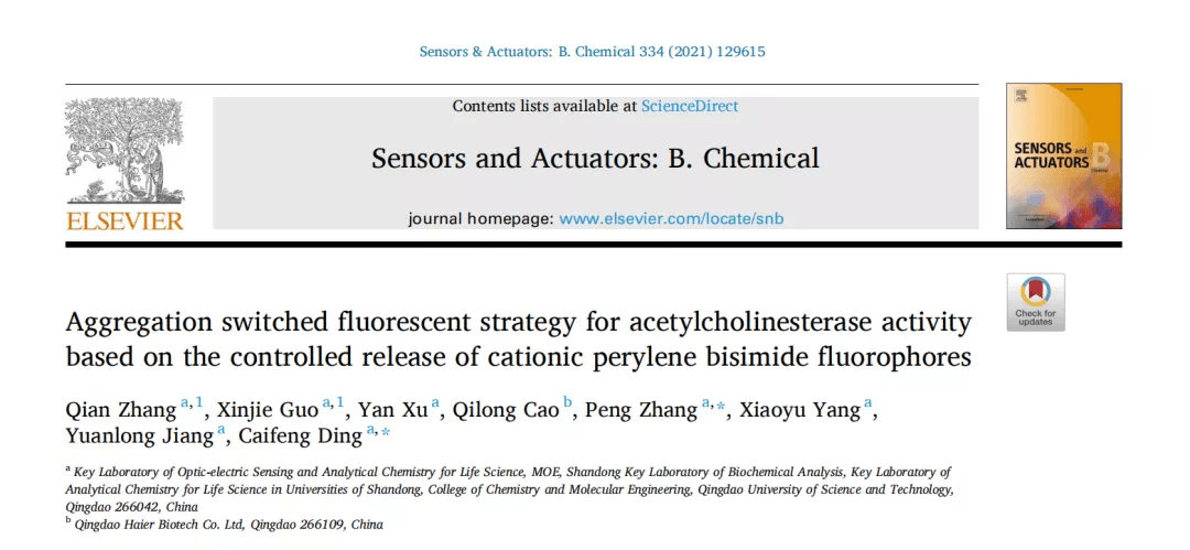 近日,国际著名SCI期刊《Sensors and Actuators B: Chemical》刊登了由青岛海尔生物科技有限公司与青岛科技大学化学与分子工程学院联合发表的学术论文,题为《Aggregation switched fluorescent strategy for acetylcholinesterase activity based on the controlled release of cationic perylene bisimide fluorophores》(苝酰亚胺阳离子聚集体控制释放的乙酰胆碱酯酶活性荧光传感策略),报道了团队在神经传感分析方面的研究成果(全文链接:https://doi.org/10.1016/j.snb.2021.129615)。