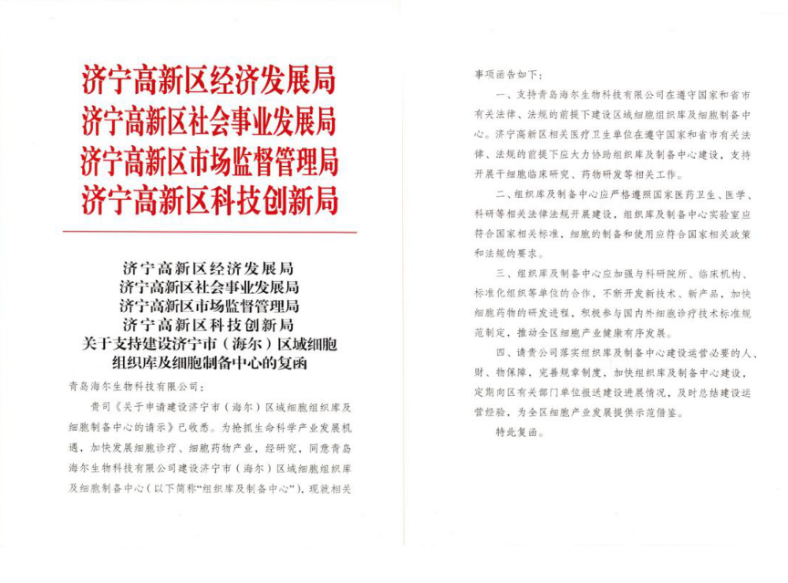 9月18日,山东省济宁市高新区经济发展局、社会事业发展局、市场监督管理局、科技创新局等多部门联合下发《关于支持建设济宁市(海尔)区域细胞组织库及细胞制备中心的复函》(以下简称复函),正式批复同意青岛海尔生物科技有限公司开展济宁市区域细胞制备中心的建设工作。